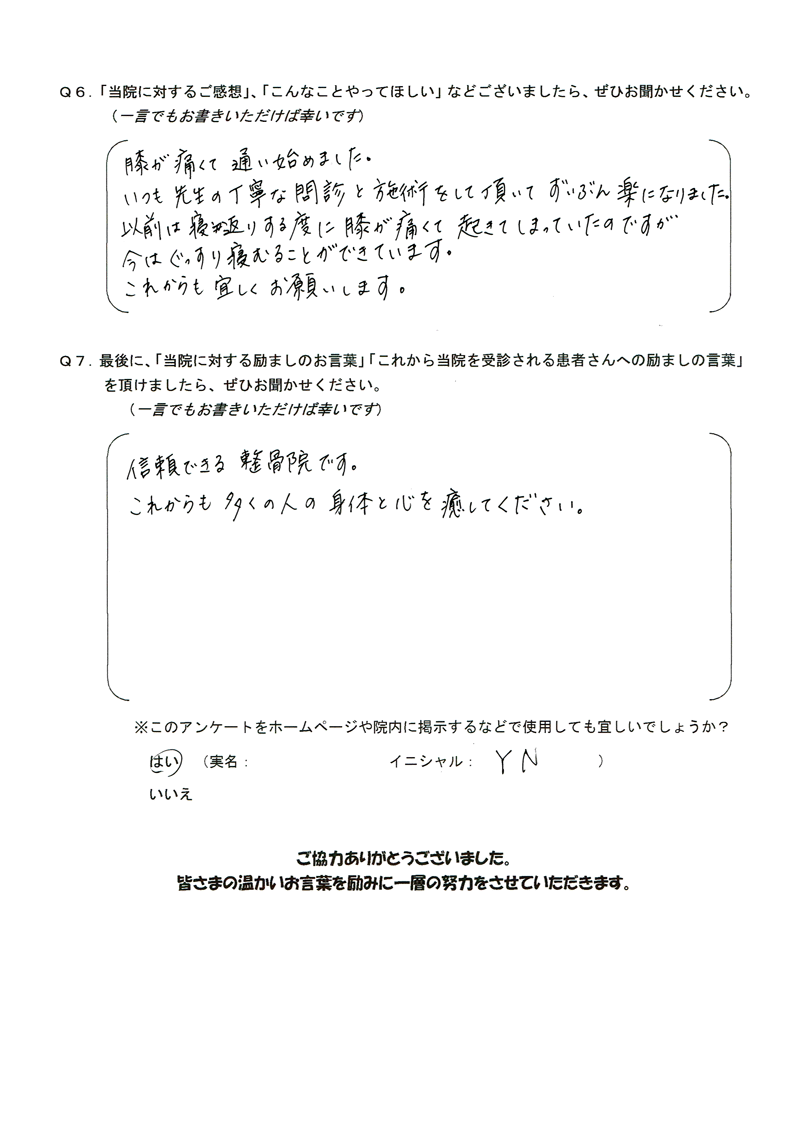 膝が痛くて通い始めました。いつも先生に丁寧な問診と方施術をして頂いてずいぶん楽になりました。以前は寝返りする度に膝が痛くて起きてしまっていたのですが、今はぐっすり眠ることができています。これからも宜しくお願いします。みんなの森整骨院さんは、信頼できる整骨院です。これからも多くの人の身体と心を癒してください。(50代 女性 Y.N.様)