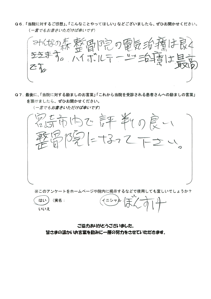 「ハイボルテージ治療」は最高です。宮崎市内で評判の良い整骨院になって下さい。(60代 ぼんすけ様)