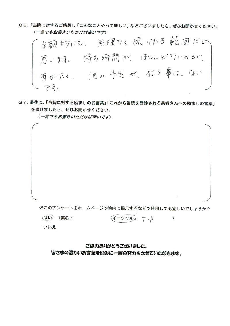 待ち時間が、ほとんどないのがありがたく、他の予定が狂う事はないです。(60代 女性 T.A様)